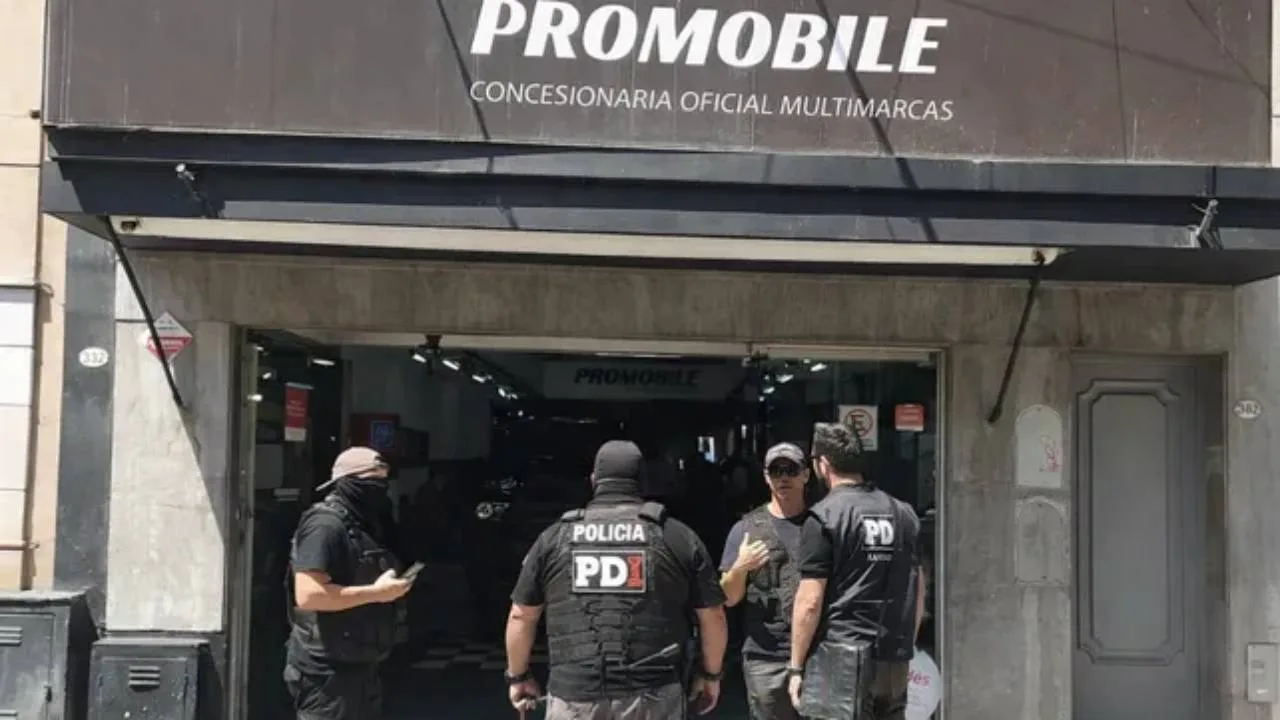 Uno de los puntos requisados de la jornada fue una concesionaria de autos ubicada en calle Hipólito Yrigoyen al 2400, en pleno macrocentro de la ciudad de Santa Fe. Bajo las órdenes del fiscal Alejandro Benítez, agentes de la Policía de Investigaciones (PDI) y la Prefectura Naval Argentina trabajaron en el lugar, donde secuestraron una camioneta Ford Ranger de interés para la causa y procedieron a la aprehensión de personas vinculadas al comercio.