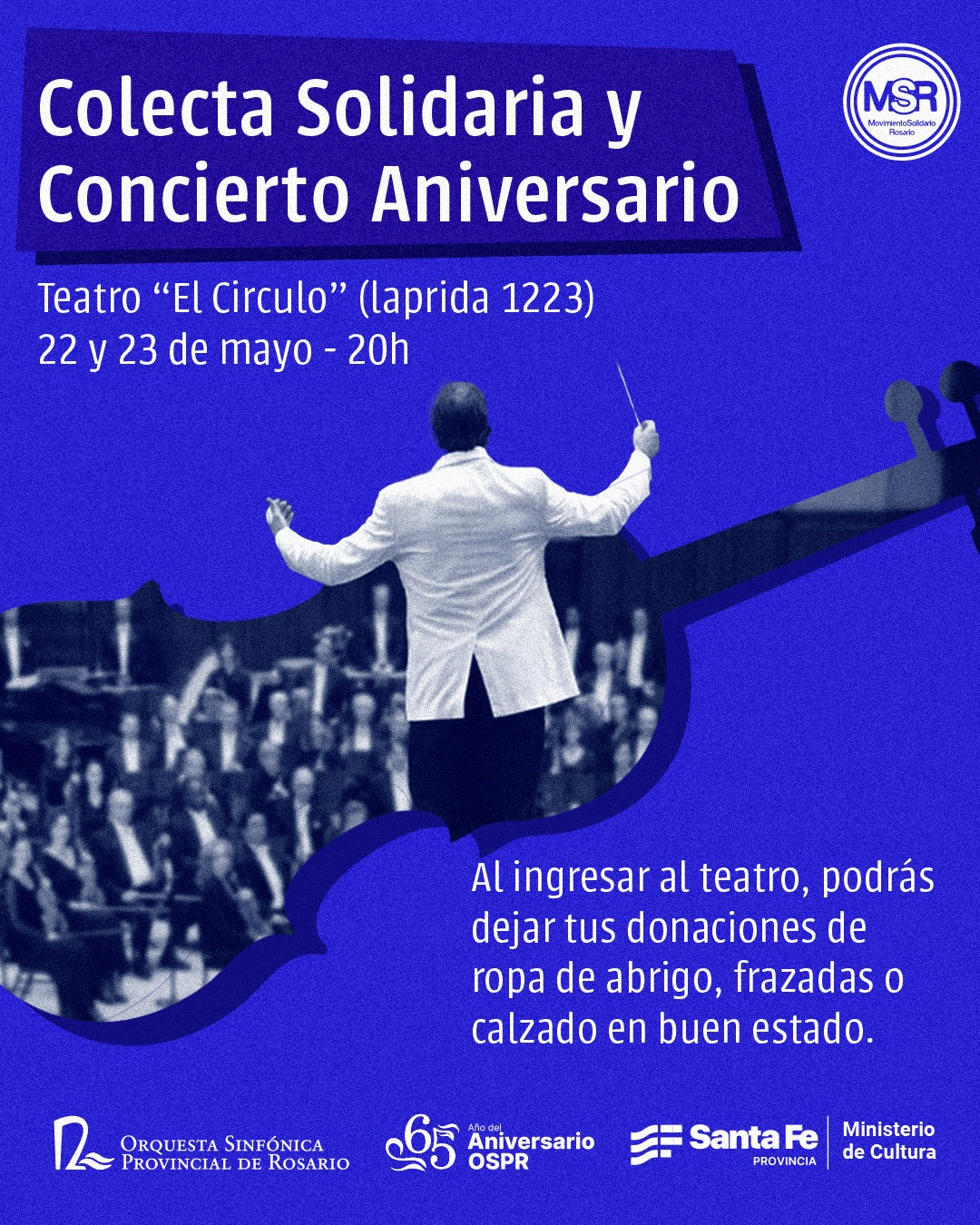 La Orquesta Sinfónica Provincial de Rosario, dependiente del Ministerio de Cultura de Santa Fe, brindará dos conciertos solidarios para conmemorar su 65° aniversario. Las funciones serán este jueves 22 y viernes 23 de mayo, a las 20, en el Teatro El Círculo de Rosario, ubicado en Laprida y Mendoza.