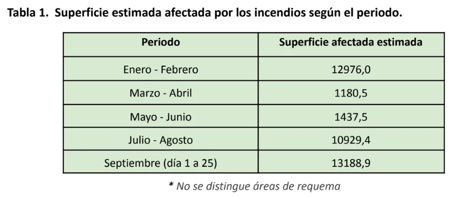 El dato más preocupante es que entre el 1 y el 25 de septiembre se estimaron 13.188,9 hectáreas afectadas por incendios. Y con ese dato, se prevé que en el bimestre septiembre-octubre el área afectada por el fuego será importante.