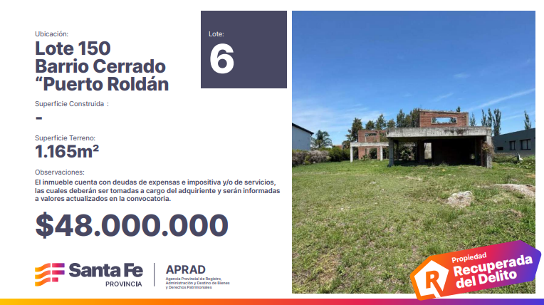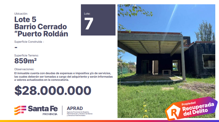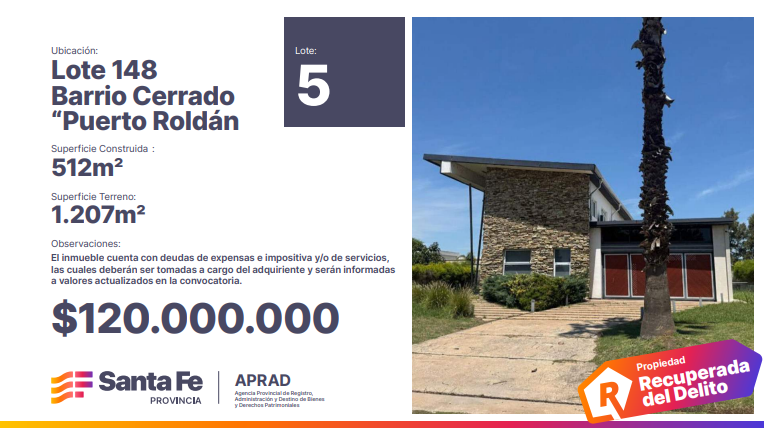 El gobierno provincial habilitó desde el pasado miércoles 26 de febrero las inscripciones para la subasta de bienes decomisados a organizaciones criminales. Entre las joyas y vehículos a rematar se encuentran tres inmuebles ubicados en Puerto Roldán, un exclusivo barrio cerrado de la localidad vecina ubicado a pasos de Funes.