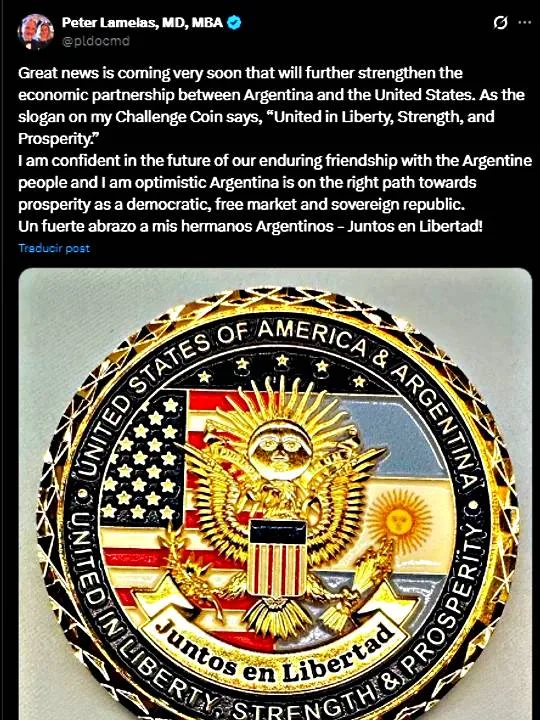 «Pronto tendremos grandes noticias que fortalecerán aún más la alianza económica entre Argentina y Estados Unidos. Como dice el lema de mi Moneda de Desafío: ‘Unidos en Libertad, Fuerza y Prosperidad'», indicó a través de un mensaje que difundió por su cuenta de la red social X.