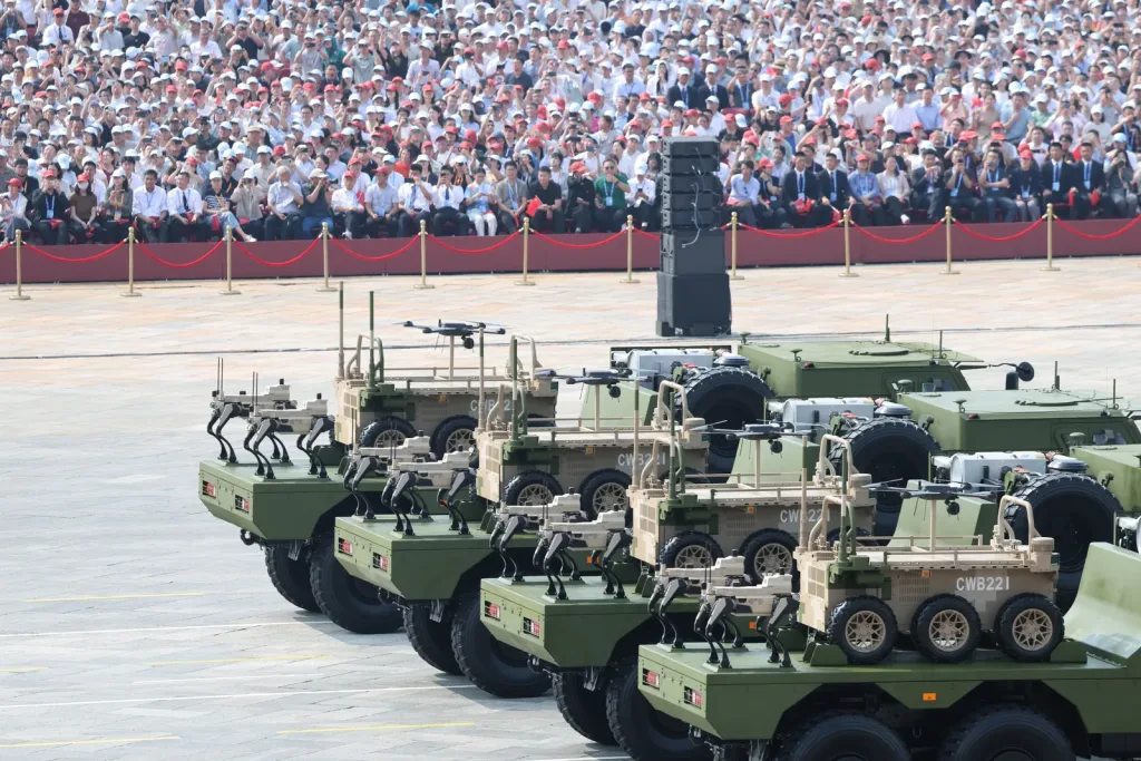El avance tecnológico de las fuerzas armadas chinas quedó demostrado por los numerosos dispositivos dotados de IA y la entrada oficial de formaciones terrestres no tripuladas. En particular, desfilaron vehículos denominados «lobos robot» o «perros negros». En 2024, un perro mecánico equipado con munición letal apareció en imágenes de la televisión oficial china durante unas maniobras militares conjuntas con Camboya. Se trata de robots con un fusil automático a la espalda y diseñados para acercarse rápida y ágilmente al enemigo.