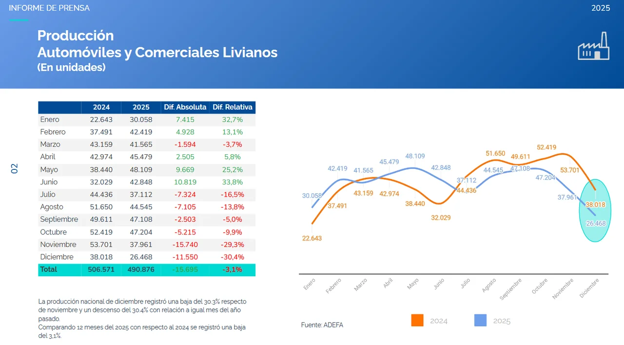 En diciembre, la producción fue de 26.468 unidades, 30,3% menos respecto de noviembre y 30,4 % por debajo de diciembre de 2024.
