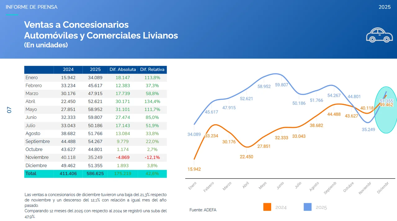 En ventas mayoristas, el sector comercializó a la red de concesionarios 51.355 vehículos en diciembre, 45,7% más respecto de noviembre, y 3,8% por sobre el volumen de diciembre del 2024.