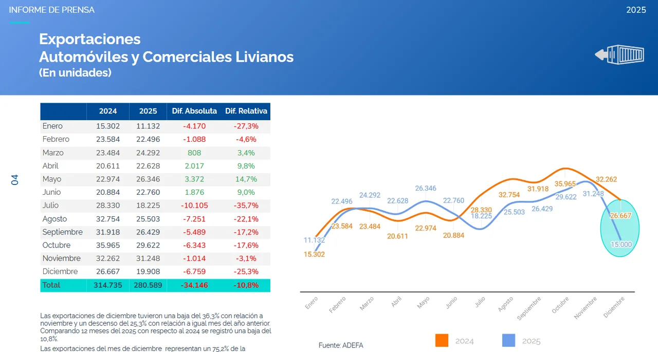 En materia de comercio exterior, las terminales exportaron 19.908 vehículos en diciembre, lo que representó una baja del 36,3% respecto de noviembre y del 25,3% en la comparación interanual.