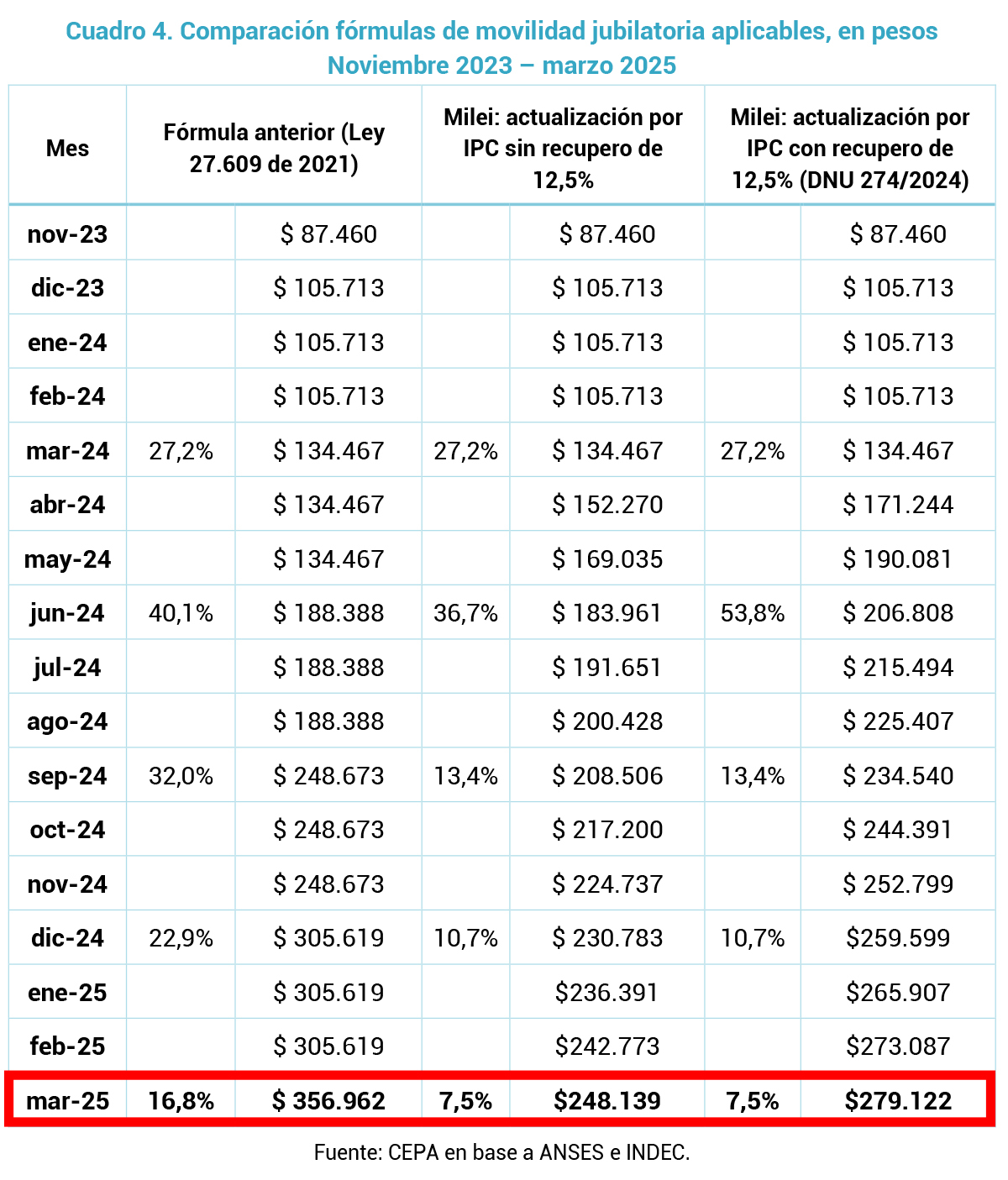 La fórmula que regía antes del decreto combinaba la evolución de los salarios y la recaudación. Según los cálculos de CEPA en base a los datos del Indec y de la Ansés, una jubilación mínima sin bono con ese mecanismo estaría hoy en 403.302 pesos. Esto es, un 32% más que los 304.726 actuales. Algo similar ocurre con los otros niveles de haberes jubilatorios.