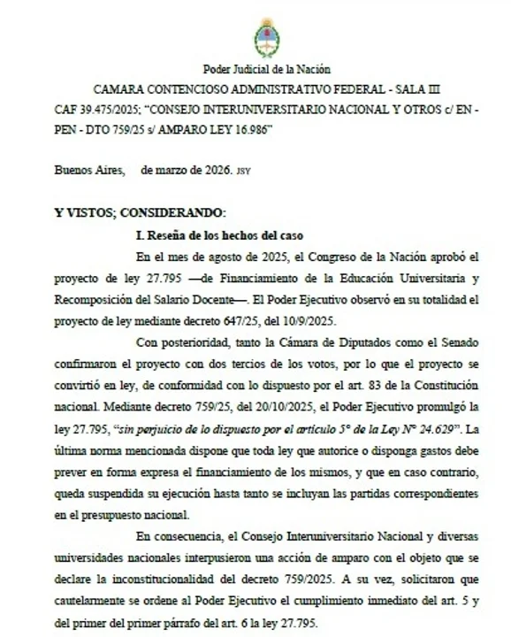 El mes pasado, el Gobierno Nacional apeló la medida cautelar que lo obligaba a aplicar la ley, a través de la Procuración del Tesoro, dictada en diciembre de 2025, luego de un amparo llevado adelante por el Consejo Interuniversitario Nacional (CIN).