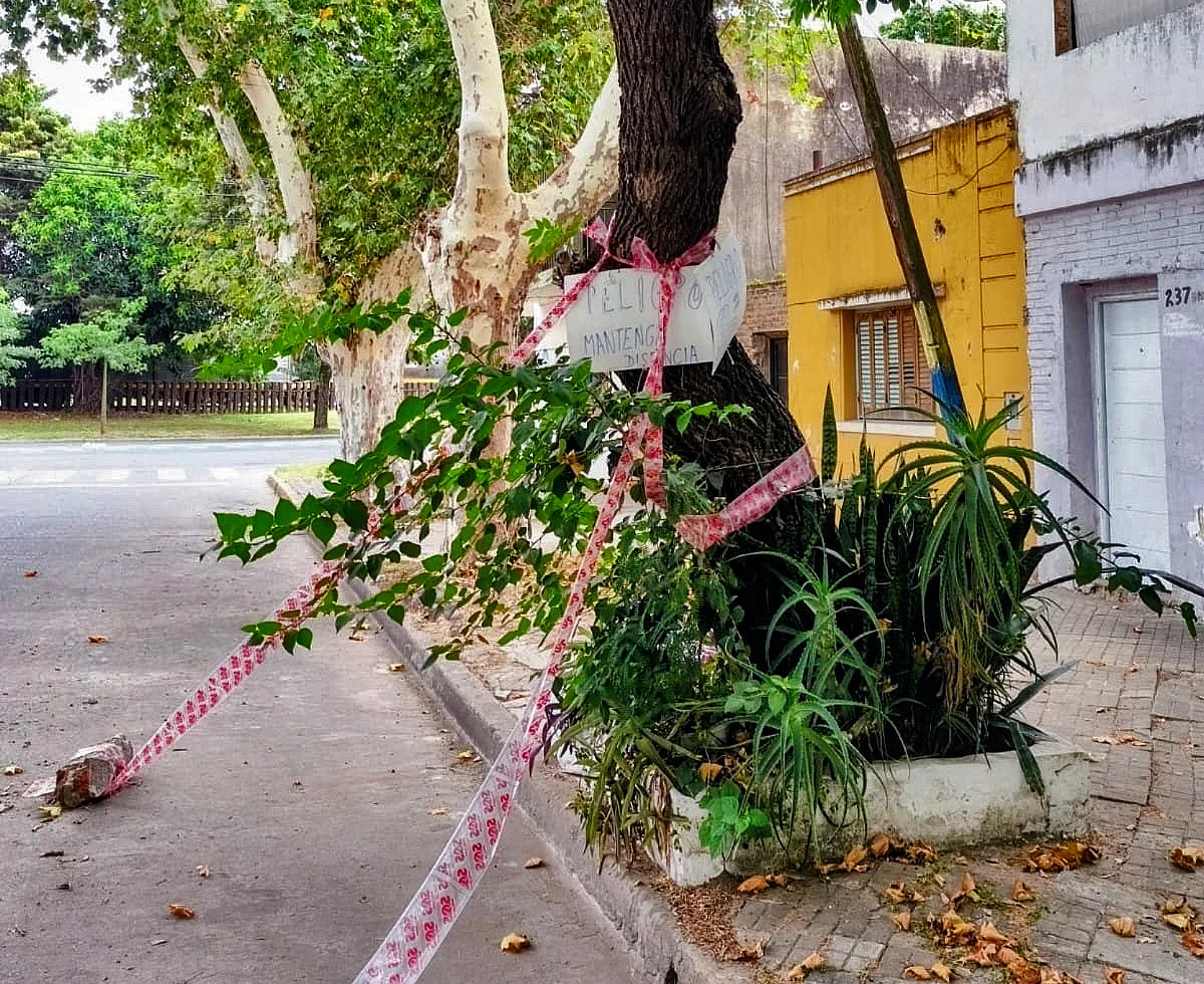 Los carteles que alertan sobre el peligro a automovilistas y peatones son obra, explicó la vecina, de un integrante de la Casa Solidaria Malvinas Argentinas. Blanca recordó que hace un año, un camión con caja de gran altura arrasó con el tendido eléctrico en la cuadra y con varias ramas del ejemplar, que tras el incidente quedó peligrosamente inclinado sobre el asfalto.