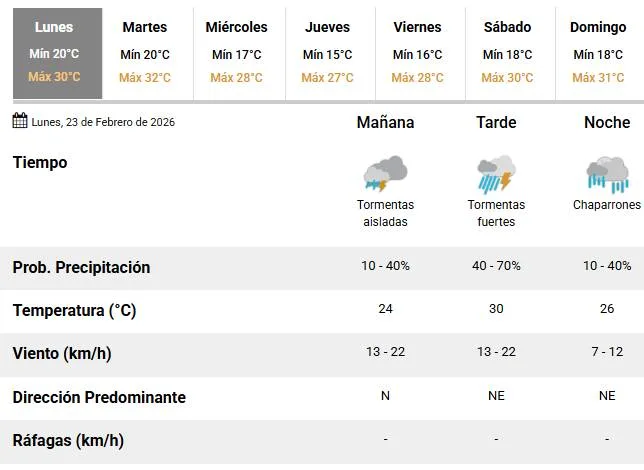 Se prevén tormentas aisladas en la mañana, tormentas fuertes en la tarde y chaparrones por la noche. Vientos del norte en la mañana y del noreste en la tarde y noche.