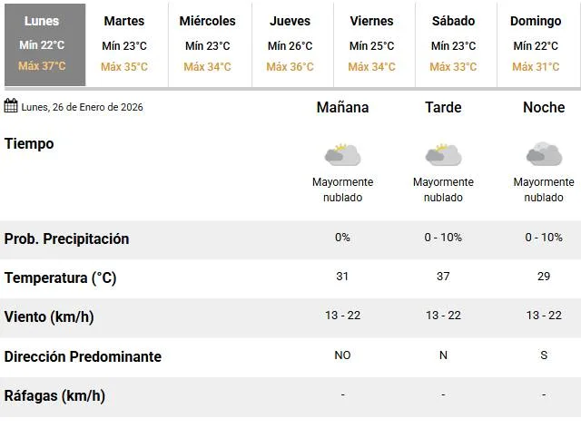 Lunes con alerta por calor en la ciudad. Ser trata de un alerta naranja, muy peligrosa por las altas temperaturas. El Servicio Meteorológico Nacional (SMN) anunció para este 26 de enero una temperatura mínima de 22 °C y una máxima que rondará en los 37 °C.