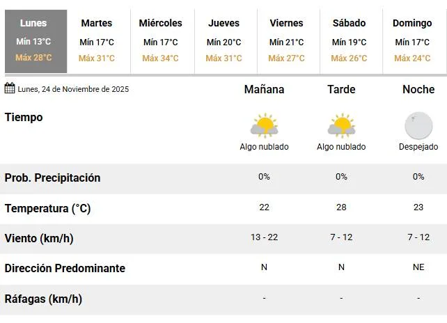 Lunes con buen tiempo en rosario y aún parte de este fin de semana XXL. El Servicio Meteorológico Nacional (SMN) anunció para este 24 de noviembre una temperatura mínima de 13 °C y una máxima que rondará en los 28 °C.