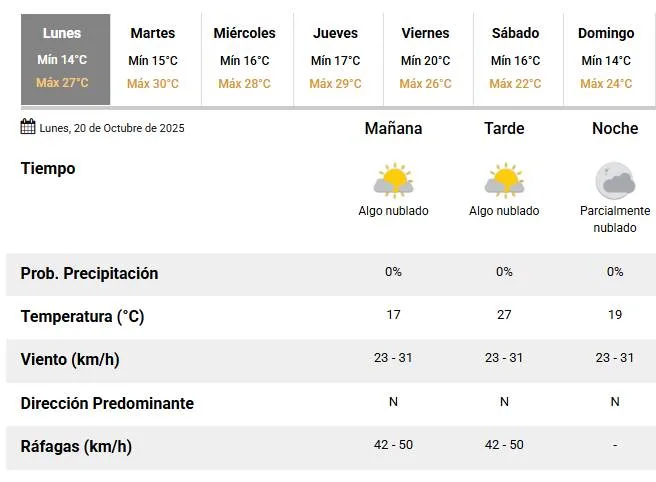 Lunes con buen tiempo, pero mucho viento en la mañana y en la tarde. El Servicio Meteorológico Nacional (SMN) anunció para este 20 de octubre una temperatura mínima de 14 °C y una máxima que rondará en los 27 °C.