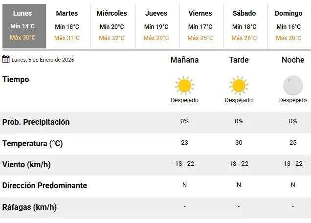 Buen tiempo para este lunes víspera de los Reyes Magos. El Servicio Meteorológico Nacional (SMN) anunció para este 5 de enero una temperatura mínima de 14 °C y una máxima que rondará en los 30 °C.