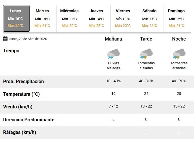 Lunes con tiempo inestable en Rosario. El Servicio Meteorológico Nacional (SMN) anunció para este 20 de abril una temperatura mínima de 16 °C y una máxima que rondará en los 24 °C.