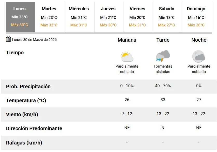 Lunes con humedad, neblinas y posibles tormentas aisladas en la tarde. El Servicio Meteorológico Nacional (SMN) anunció para este 30 de marzo una temperatura mínima 23 °C y una máxima que rondará en los 33°C.