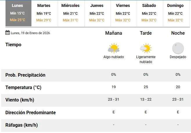 El cielo estará algo nublado en la mañana y ligeramente nublado en la tarde. Vientos del este durante toda la jornada.