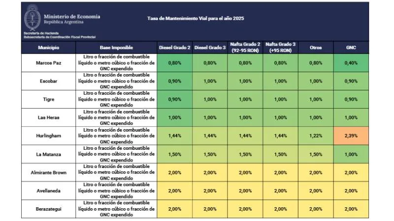 En el caso de La Matanza y Hurlingham, el monto de la tasa es del 1,5% y 1,44% respectivamente. Por debajo de esas localidades se ubican Las Heras, Tigre, Escobar y Marcos Paz, que ninguna supera el 1% del valor del combustible.