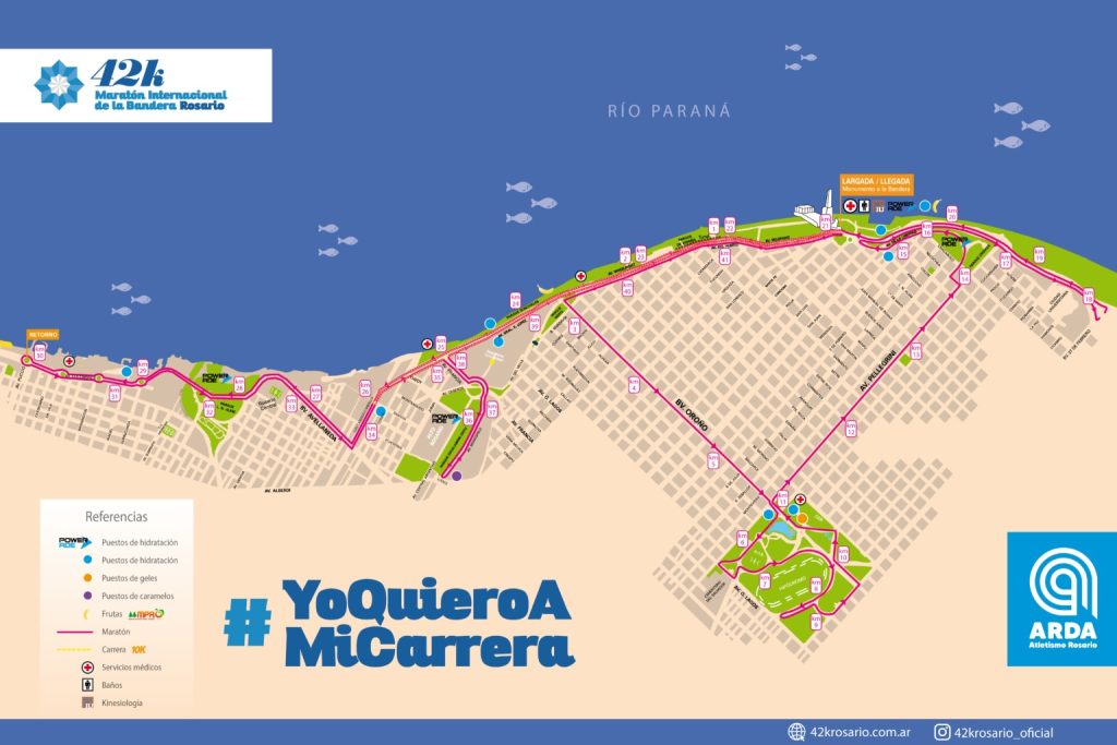 La largada de la prueba principal, de 42 kilómetros, está prevista para las 8, frente al Monumento Nacional a la Bandera (avenida Belgrano y Córdoba), mientras que a las 8:15 comenzará la prueba complementaria de 10 kilómetros. En tanto, la finalización del evento será alrededor de las 14.