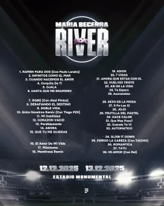 La gran galamusical, que agotó localidades en tiempo récord, fue pensada como una celebración personal y profesional. María atravesó meses intensos, tanto a nivel laboral como emocional, y el River 360° funcionó como una especie de consagración y desahogo frente a miles de fanáticos que la acompañan desde sus inicios y que cantaron cada una de sus canciones en medio de una euforia sin precedentes.