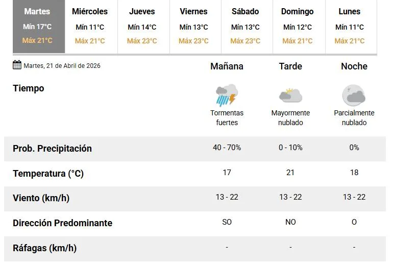 Martes inestable y con un alerta amarilla que rige por la mañana por tormentas fuertes. El Servicio Meteorológico Nacional (SMN) anunció para este 21 de abril una temperatura mínima de 17 °C y una máxima que rondará en los 21 °C.