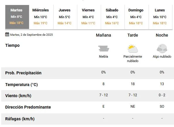 El Servicio Meteorológico Nacional (SMN) anunció para este 2 de septiembre una temperatura mínima de 8 °C y una máxima que rondará los 18 °C.