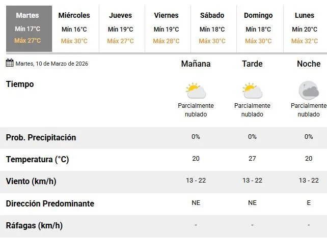 Buen tiempo en la ciudad para este martes. El Servicio Meteorológico Nacional (SMN) anunció para este 10 de marzo una temperatura mínima de 17 °C y una máxima que rondará en los 27 °C.
