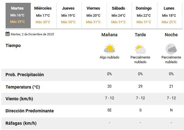 Martes con buen tiempo en la ciudad. El Servicio Meteorológico Nacional (SMN) anunció para este 2° de diciembre una temperatura mínima de 16 °C y una máxima que rondará en los 29 °C.