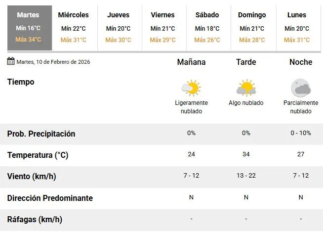 Martes con calor en Rosario. El Servicio Meteorológico Nacional (SMN) anunció para este 10 de febrero una temperatura mínima de 16 °C y una máxima que rondará en los 34 °C.
