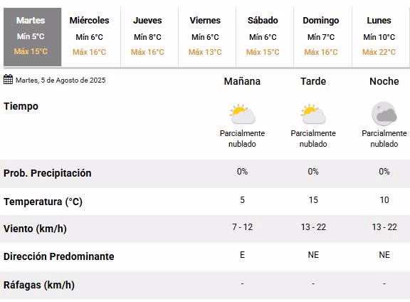 Martes con frío y cielo parcialmente nublado durante todo el día. El Servicio Meteorológico Nacional (SMN) anunció para este 5 de agosto una temperatura mínima de 5 °C y una máxima que rondará en los 15 °C.