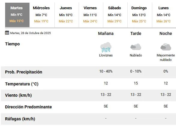 Martes frío en la ciudad. El Servicio Meteorológico Nacional (SMN) anunció para este 28 de octubre una temperatura mínima de 9 °C y una máxima que alcanzará los 15 °C.