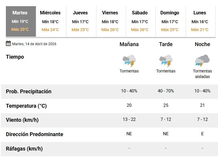 Martes con tiempo inestable y se prevén tormentas en la mañana y tarde y tormentas aisladas en la noche. El Servicio Meteorológico Nacional (SMN) anunció para este 14 de abril una temperatura mínima de 19 °C y una máxima que rondará en los 25 °C.
