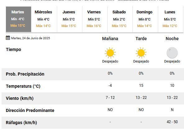 El Servicio Meteorológico Nacional (SMN) anunció para este 24 de junio una temperatura mínima de -4°C y una máxima que rondará en los 15 °C