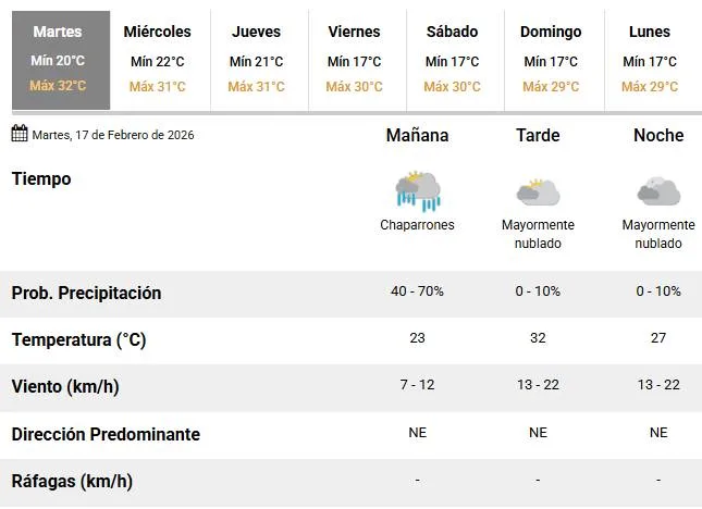 Tiempo aún inestable en la ciudad. El Servicio Meteorológico Nacional (SMN) anunció para este 17 de febrero una temperatura mínima de 20 °C y una máxima que rondará en los 32 °C.