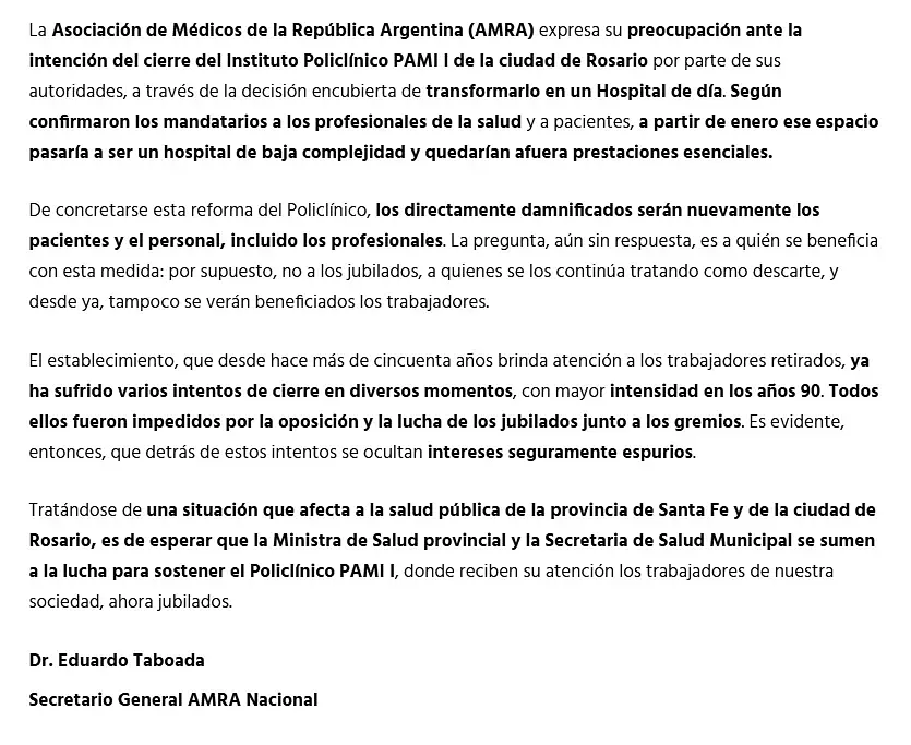 “De concretarse esta reforma del Policlínico, los damnificados directos serán nuevamente los pacientes y el personal, incluido los profesionales. La pregunta, aún sin respuesta, es a quién se beneficia con esta medida: por supuesto, no a los jubilados, a quienes se los continúa tratando como descarte, y desde ya, tampoco se verán beneficiados los trabajadores”, señala el comunicado con la firma del secretario general de Amra, Eduardo Taboada.