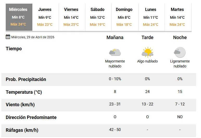 El cielo estará mayormente nublado en la mañana con ráfagas de viento de entre 42 y 50 kilómetros por hora y cielo algo nublado en la tarde. Vientos del oeste en la mañana y tarde y del noroeste en la noche.