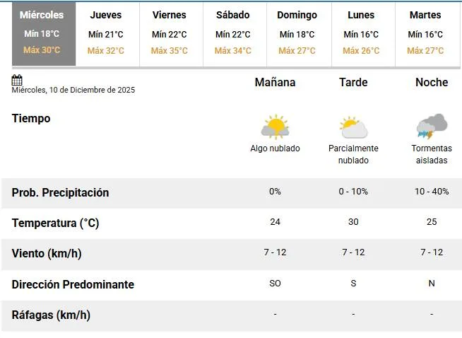 Mitad de semana y con un tiempo inestable por la noche. El Servicio Meteorológico Nacional (SMN) anunció para este 10 de diciembre una temperatura mínima de 18 °C y una máxima que rondará en los 30 °C.