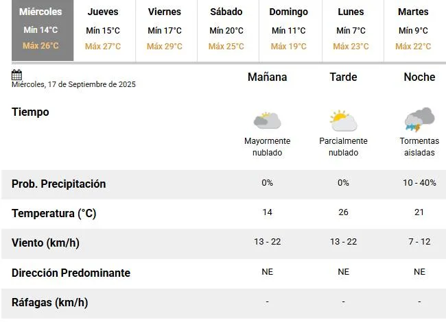 El Servicio Meteorológico Nacional (SMN) anunció para este 17 de septiembre que la temperatura mínima será de 14 °C y una máxima que rondará en los 26 °C