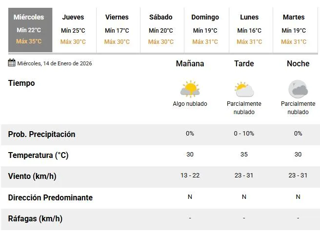 Mitad de semana y con mucho calor en la ciudad. El Servicio Meteorológico Nacional (SMN) anunció para este 14 de enero una temperatura mínima de 22 °C y una máxima que rondará en los 35 °C.