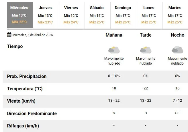 Mitad de semana y ya sin lluvias. El Servicio Meteorológico Nacional (SMN) anunció para este 8 de abril una temperatura mínima de 13 °C y una temperatura máxima que rondará en los 22°C.