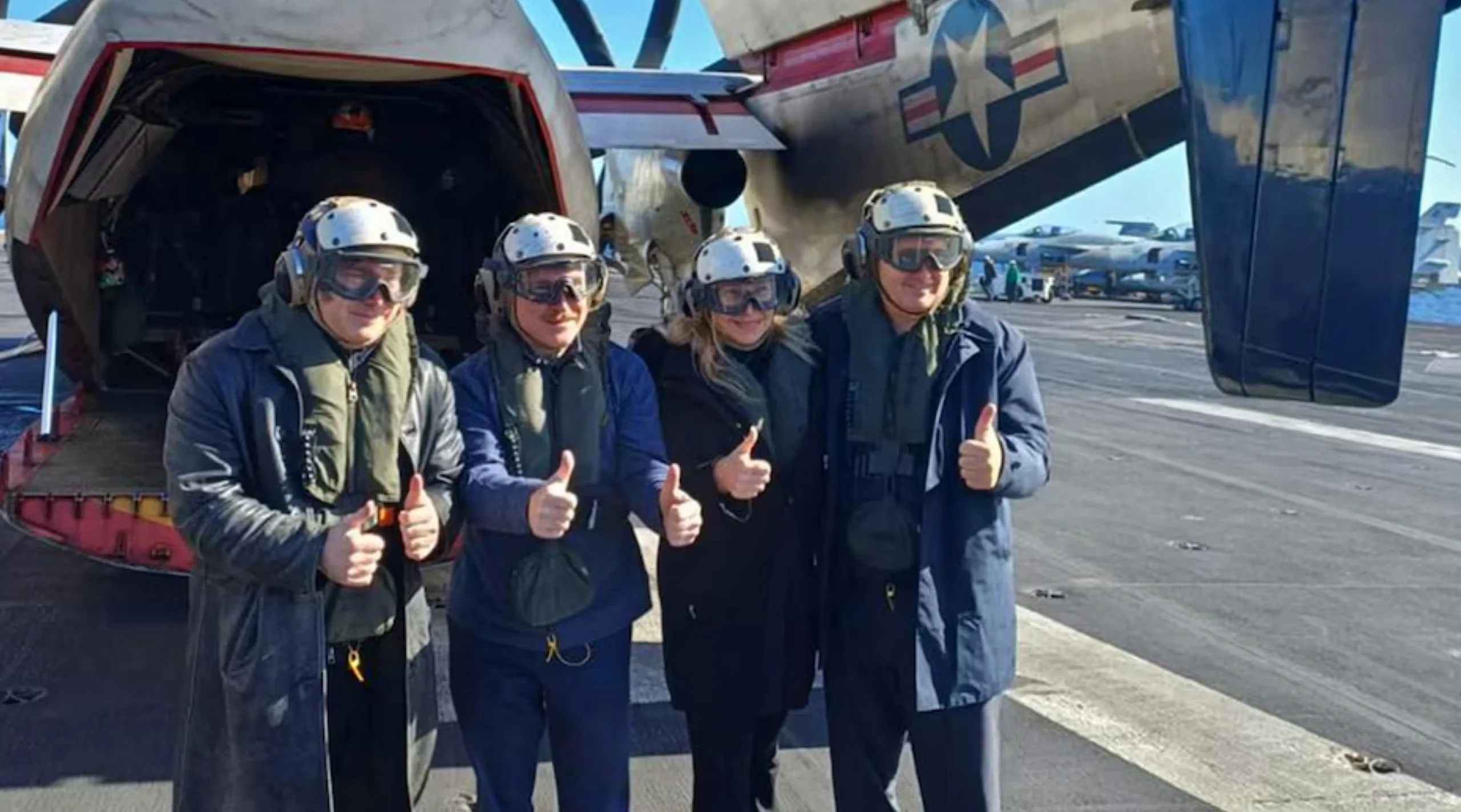 Milei se trasladó en un Grumman C-2 Greyhound estadounidense, la aeronave de transporte que opera desde y hacia la cubierta del portaaviones. El arribo del libertario coincidió con una demostración aérea de aviones F-18 y helicópteros MH-60 Seahawk, que forma parte del programa del último día de ejercicios.