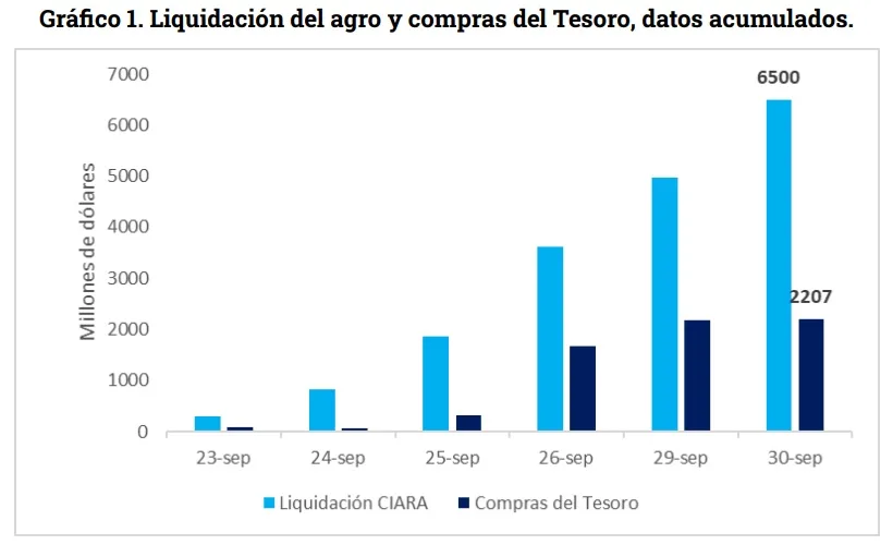 La rápida liquidación de las grandes empresas exportadoras que agotaron el cupo en sólo 3 días, hizo que el tiempo ganado sea más corto de lo previsto, y que el Tesoro compre menos de lo esperado. En concreto, de los U$S 6.500 M liquidados durante septiembre –existía la obligación de liquidar al menos el 90%–, el Tesoro sólo compró aproximadamente U$S 2.200. Pasada la fenomenal liquidación, el Tesoro volvió a ponerse en vendedor, dilapidando la totalidad de los dólares comprados los días previos y generando mayor stress en el mercado, una nueva suba sobre el riesgo país, y gran volatilidad en los activos argentinos.