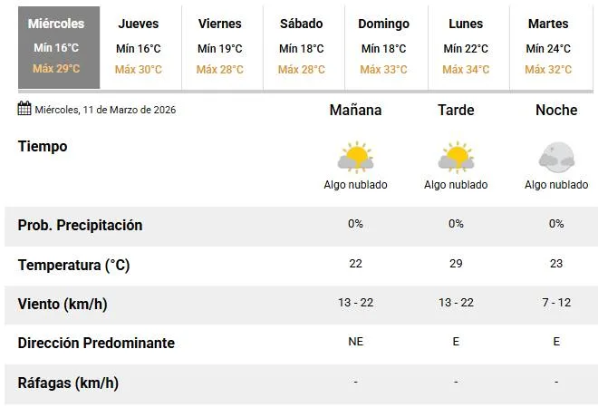 Buen tiempo para este miércoles 11 de marzo en la ciudad de Rosario. El Servicio Meteorológico Nacional (SMN) anunció una temperatura mínima de 16 °C y una máxima que rondará en los 29 °C.