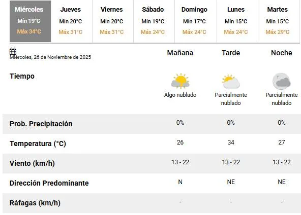 El Servicio Meteorológico Nacional (SMN) anunció para este 26 de noviembre una temperatura mínima de 19 °C y una máxima que rondará en 34 °C