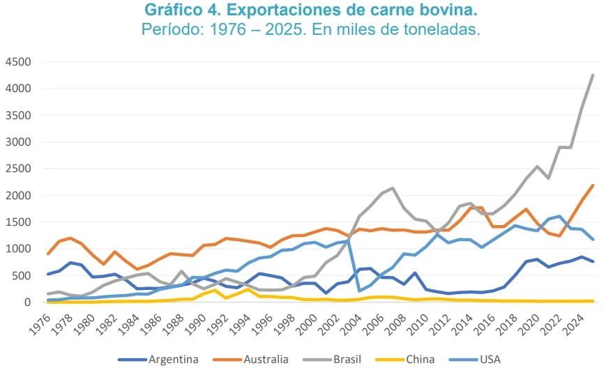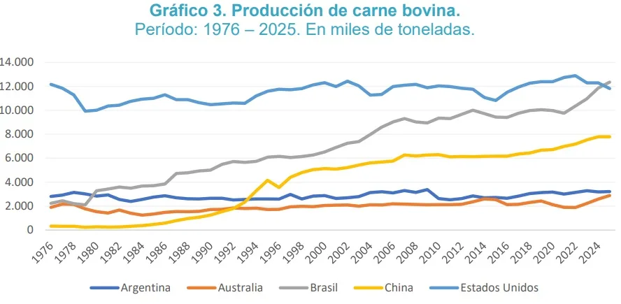 Argentina suele identificarse como un país esencialmente productor de carnes. Sin embargo, el rezago y el estancamiento de la producción cárnica nacional han limitado de manera significativa su potencial exportador, que se mantiene en una situación de marcado atraso frente a sus principales competidores: Brasil, Estados Unidos y Australia. Por su parte, China se posiciona como uno de los mayores productores mundiales de carne, aunque su producción se orienta fundamentalmente al abastecimiento del mercado interno y no al comercio internacional.