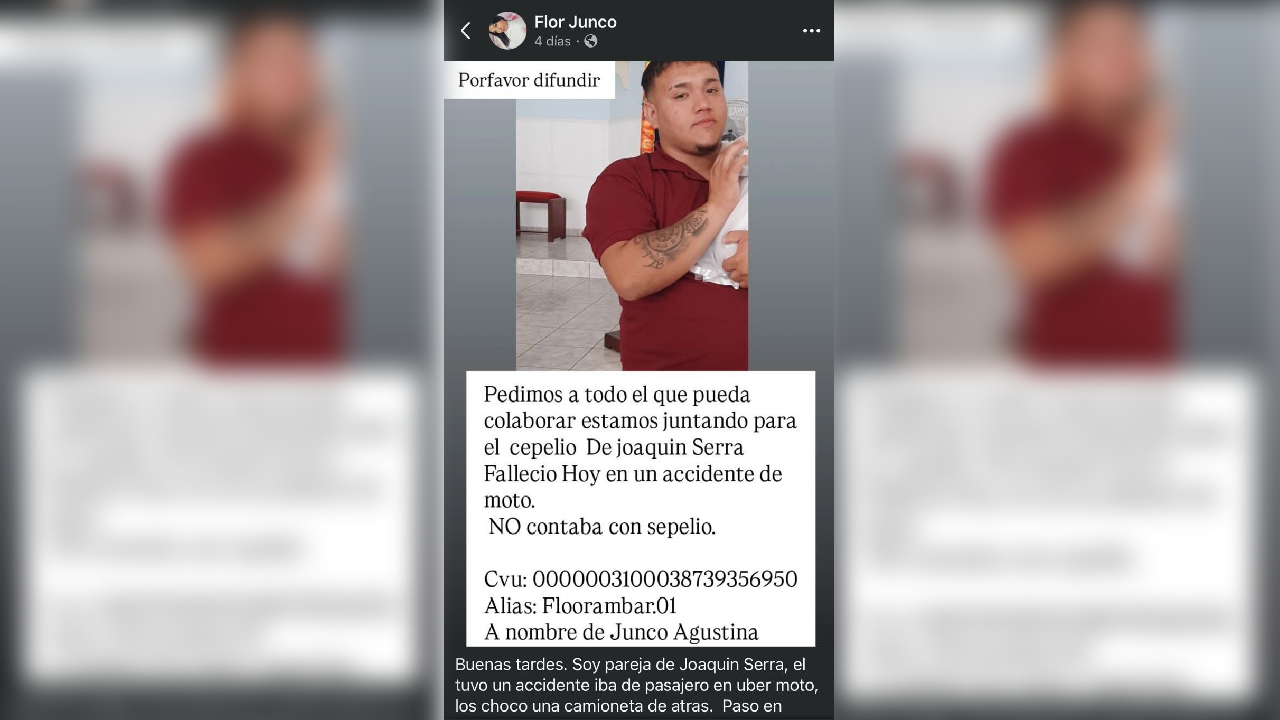 Mientras avanza la investigación judicial, la familia y los seres queridos de Joaquín Serra atraviesan un momento de profundo dolor. Ante la difícil situación de no contar con servicio de sepelio, apelaron a la solidaridad de la comunidad a través de redes sociales para recolectar fondos y poder brindarle una despedida digna. “Cualquier aporte, por pequeño que sea, así como la difusión del mensaje, es de gran ayuda”, indicó su pareja en una publicación de la red social Facebook.
