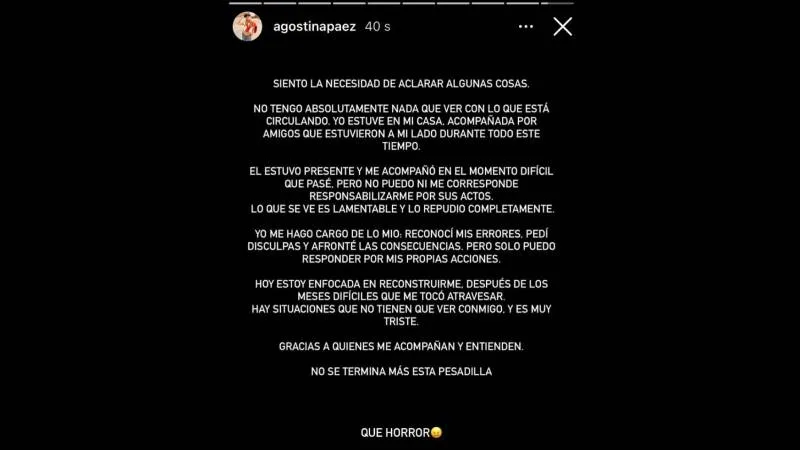 El descargo se da en un contexto de alta repercusión pública, luego de la viralización de un video atribuido a su padre, el empresario Mariano Páez, quien también salió a negar su autenticidad.