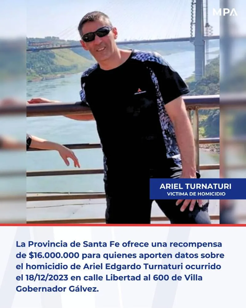 La Provincia de Santa Fe, ofrece $16.000.000 como recompensa a aquellas personas que aporten datos útiles para individualizar al autor, autores y/o partícipes primarios del homicidio de Ariel Edgardo Turnaturi. La identidad de quienes brinden información y de quienes sean adjudicatarios de la recompensa será mantenida en secreto antes, durante y después de finalizada la investigación