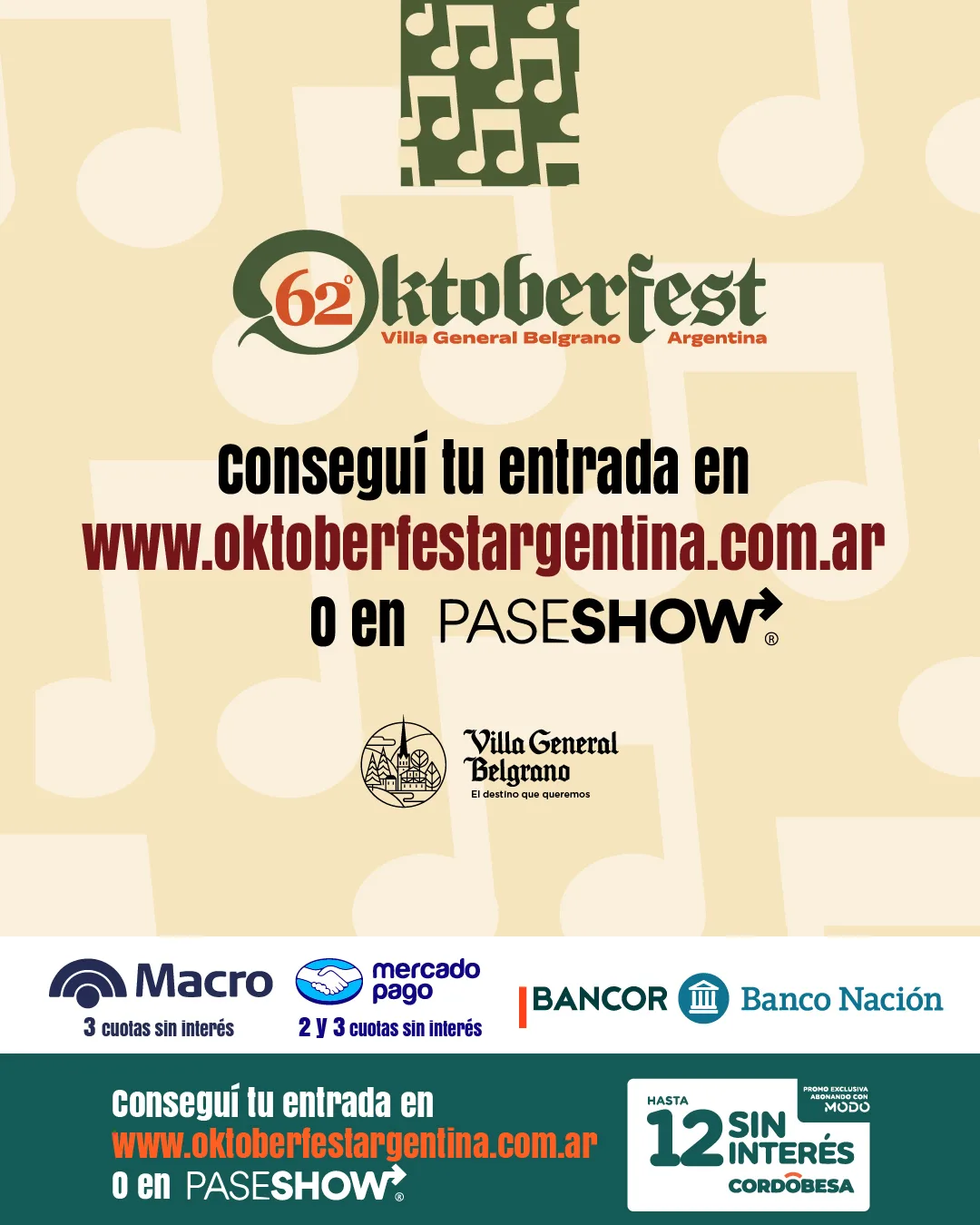 Las entradas estarán a la venta a partir del lunes 21 de julio en el sitio oficial: www.oktoberfestargentina.com.ar