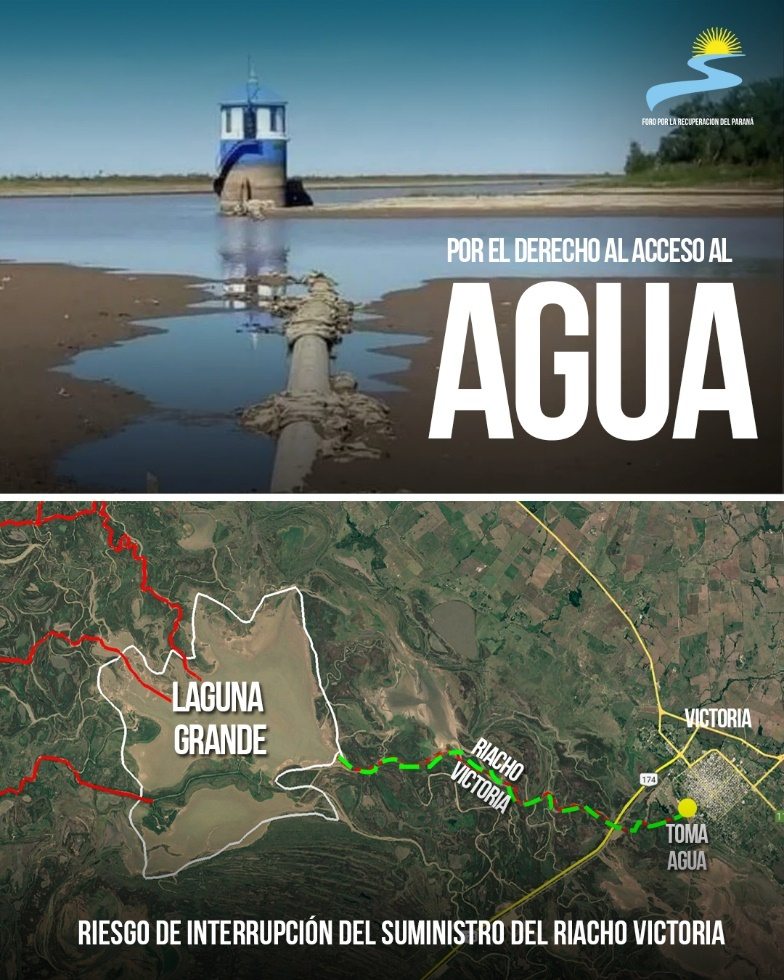 Para los 40.000 habitantes de la ciudad de Victoria, el acceso al agua resulta vital. Sin embargo, como ya pudo verificarse en momentos de bajantes del nivel del río, se ha estado cada vez más al límite en la posibilidad de asegurar la provisión de agua. Sucede que la Laguna Grande, que cada vez es más chica como puede observarse de la foto satelital, es la que se comunica con el Riacho Victoria en donde se encuentra la toma de agua de la ciudad.