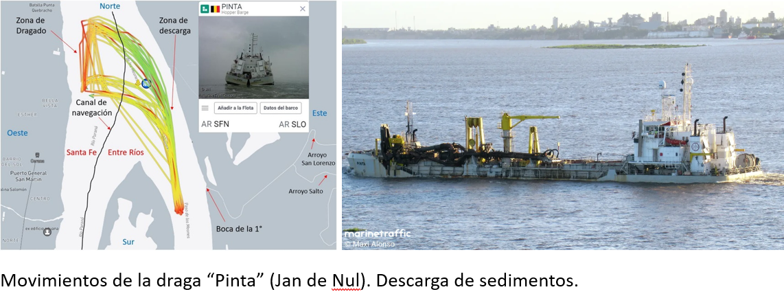 En la imagen que vemos a continuación, obtenido del portal marinetraffic.com , podemos ver a modo de ejemplo, el registro de movimientos de la Draga “Pinta” perteneciente a la empresa belga Jan de Nul, que tiene aún la concesión de las tareas de dragado del canal de navegación principal de nuestro río Paraná. Allí puede observarse con claridad el tipo de maniobra que se realiza para arrojar el material removido sobre la costa de las islas, y lo que posteriormente por el propio escurrimiento de las aguas, se va desplazando y acumulando en las bocas de los riachos y arroyos interiores.
